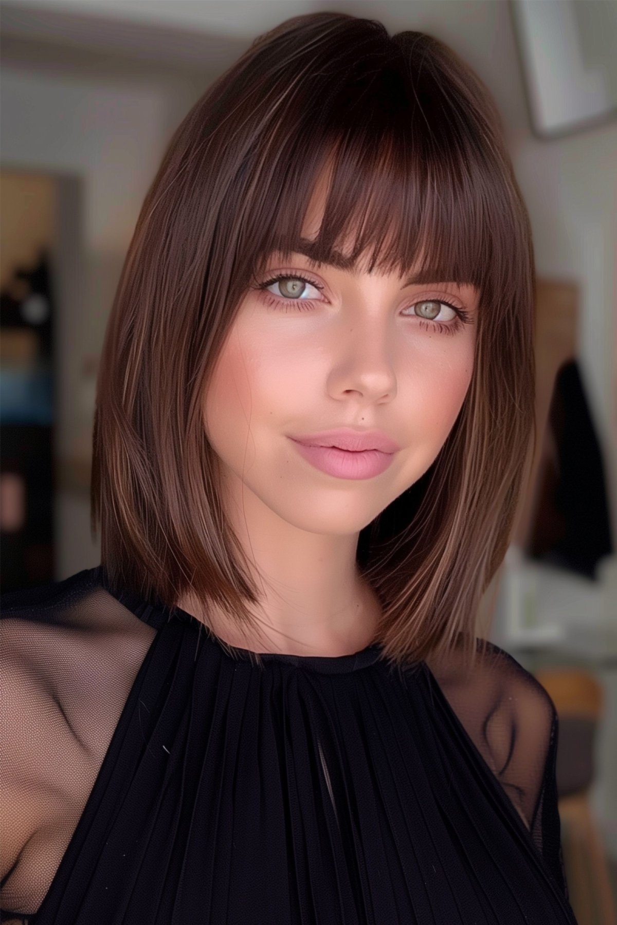 Bangs paired with shoulder blunt bob can elevate your sensuousness. A shoulder-length bob typically has a straight edge. This is ultra-modern and is the perfect option to frame your face. If you have a wide forehead or wrinkles on the forehead, go for it.