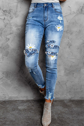 5. Casual Floral Print Ripped Straight Denim Jeans