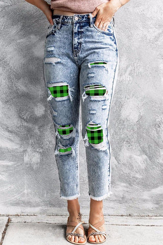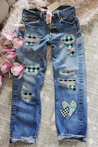 1. Mint Green Plaid Heart Straight-Leg Ripped Jeans