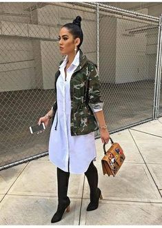 Sweater dresses are a versatile wardrobe staple for all body types. A sweater dress can be paired with an oversize camo jacket. For a refreshing look, this outfit would look good with white sneakers or black leather boots. This camo jacket outfit looks especially good on short, curvy women.