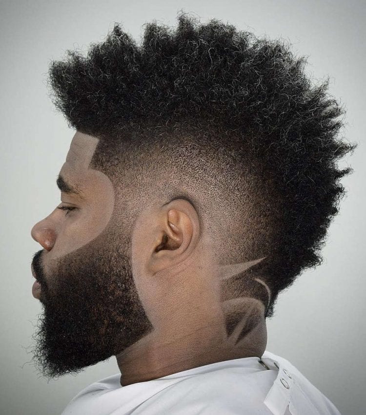 A combination of a sleek drop fade and a mo-hawk. As you can see, the neckline has a fancy cut. You can do any fancy lines at the neckline that fascinates you. Instead of having a faded temple, blend it with your beard to add more definition to your facial structure.