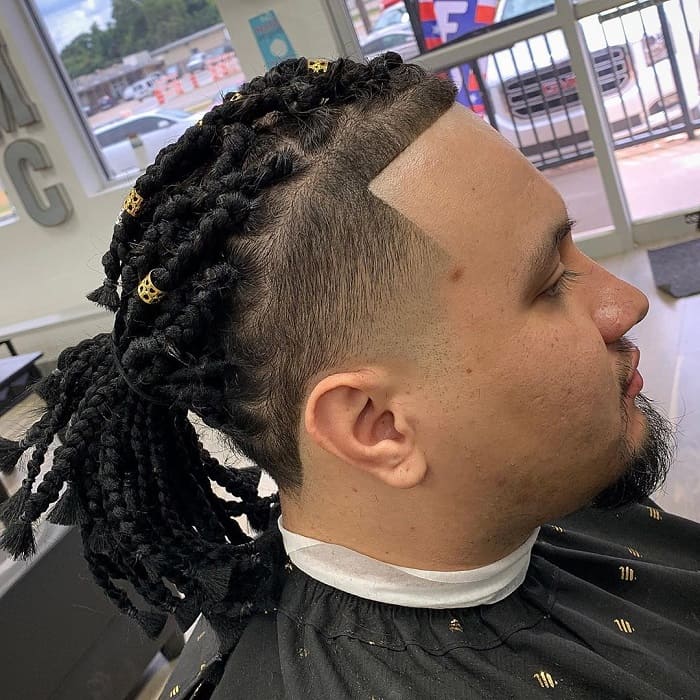 Create braids using black textile threads or jumbo hair. Do the sectioning correctly and pin the knits into a ponytail. This fade haircut is mainly recommended for those having round faces. Avoid overstepping the braided area while trimming.