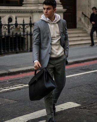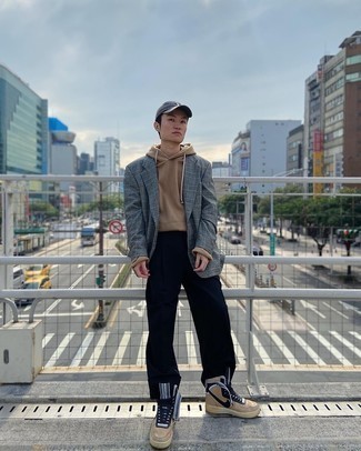If you want to look dapper in a flash, consider this outfit. A plaid wool blazer, when worn with a hoodie will create a laidback vibe. This outfit is recommended for days you want to spend relaxing. To earn the proper amount of attention, choose navy dress pants or chinos. Team this laid back look together with a pair of tan leather high top sneakers.