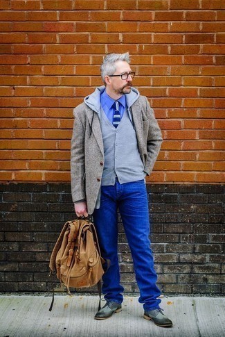 Bring more sophistication to casual fashion arsenal with this outfit idea. Choose vest, blazer, and hoodie of the same shade. Any guy can try this combination of grey blazer and blue shirt as this can have a great modern appeal. To make the whole look come together, introduce a pair of leather brogues to the equation. This outfit has a strong professional appeal and you can wear them even to office meetings. However, overweight guys should avoid this outfit as it has too many layers.