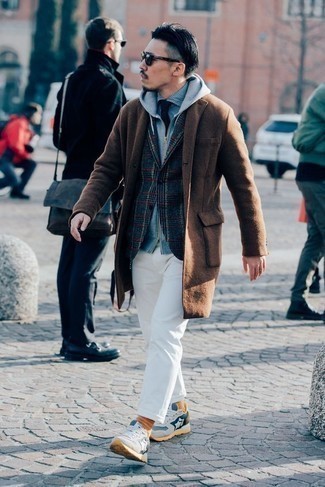 Sharp but a simple outfit. A light blue dress shirt, a grey hoodie, a charcoal plaid wool blazer, a brown overcoat, white chinos, and navy tie, that’s all you need to try this getup. You can instantly play down this outfit with a single item – a pair of white and navy athletic shoes. Such a pair of shoes can easily infuse a more relaxed vibe into this getup. Also, adding white chinos to your current wardrobe will breathe effortless elegance to it.
