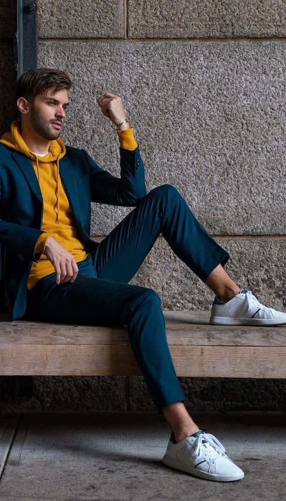 A very well executed color combination. Do you think you can’t wear hoodies to the office? Not any longer. This combination can make you appear professional. The bold color contrasting is perfect for a day to night transition. You can also try this getup to hang out with your friends at a pub. But, if you’re planning to carry on this look for your office, replace the sneaker with loafers or suede shoes.