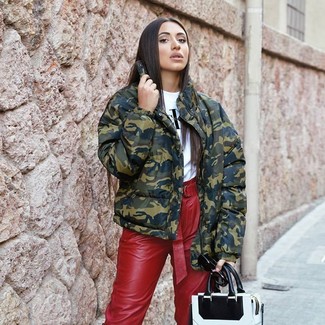 If you give priority to comfort, pick this outfit. A cargo jacket is a super cool and versatile piece. For winter, wear a camouflage puffer jacket. Replace this puffer jacket with a well-structured cargo jacket for summer. The color combination of such a camouflage jacket matches nicely with a red pant. However, make sure that your leather pant has a slim-fit cut to go well with the heavy puffer jacket. Complete this killer casual outfit with a leather tote bag.