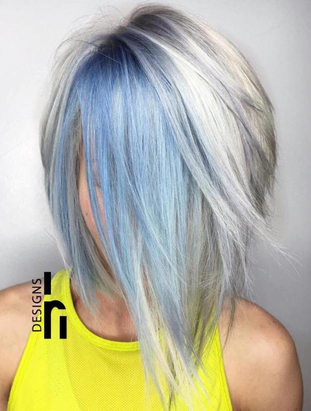 The chunky light blue accents work great on cool-toned silver shades. Go with a long layered bob cut and focus the color towards the front. Add some subtle touches of blue sparsely throughout the layers to tie the style together.