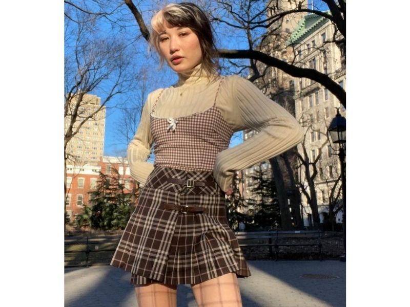Summer is just getting started, and gingham is already everywhere. Ashley from @best.dressed takes layering to the next level by using her mini bodycon dress as a top. She keeps this dark academia look cohesive by mixing similar prints—gingham and plaid—and coordinating them in a similar color scheme. It is one of those short pleated skirt outfits that you may not see everywhere.