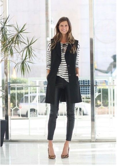 Styling a vest with leather pants is one of the easiest and top fashion trends. A white and black tee can further enhance the charm of the look. This will make you look preppy, professional, and prepared for the day ahead!