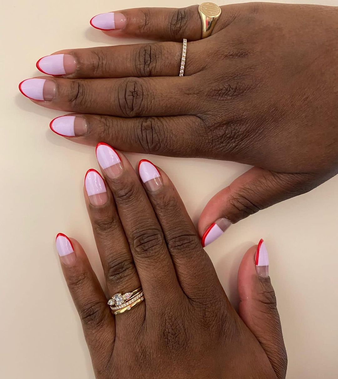 From the negative space to contrasting colors, there’s a lot to love about this mani. The thin band of red emphasizes the almond shape and makes the lilac really pop. Almond nails’ elongated shape makes them the perfect base for a pretty nail design.