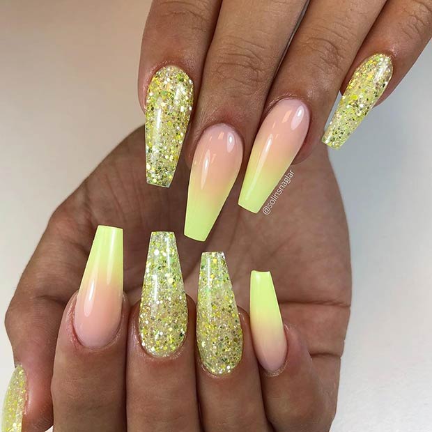 17. Pastel Yellow Nails with Glitter