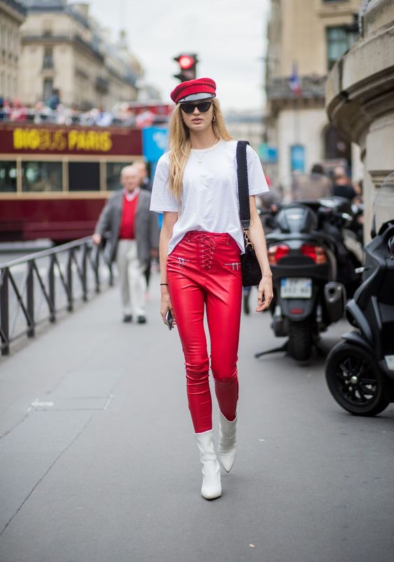 Yes, red on red. Monochrome means rocking a single color. Confused about which color to choose? Go monochrome. That’s why it is one of our favorite red leather pants outfit ideas. Very easy to do. You can either pick the same fabric or try a different one. However, if you want to avoid a too glossy look, avoid pairing the pant with a leather top. A black sunglass can bring an interesting twist to this outfit.
