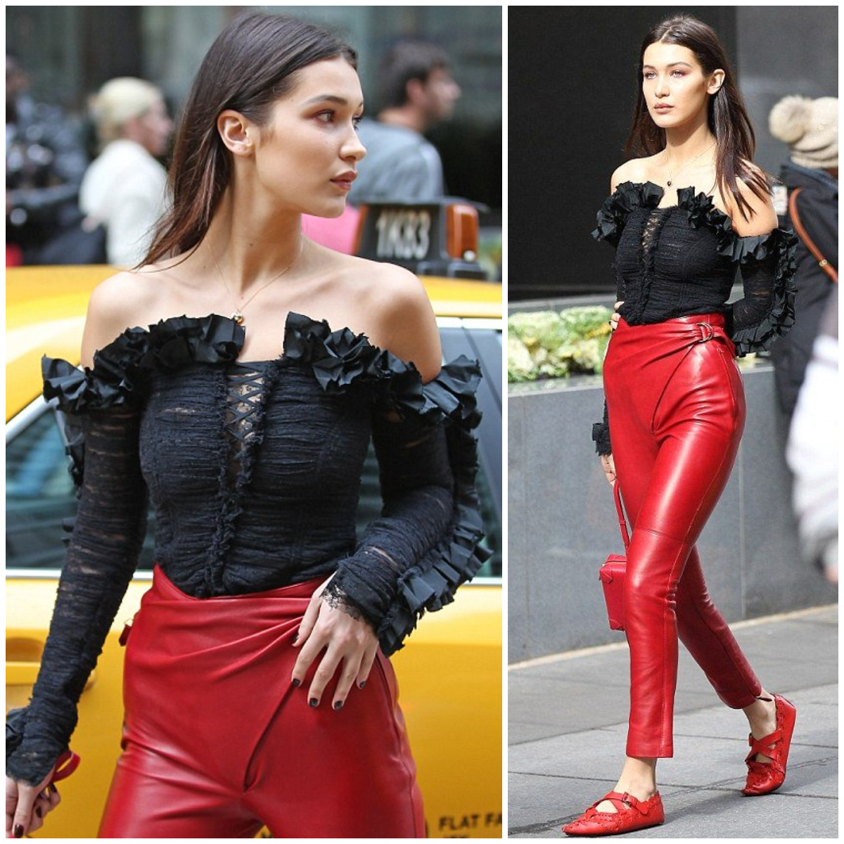 The supermodel, Bella Hadid has chosen to match Victorian-inspired black off-shoulder top with red leather skin-tight pants. Her blouse is featuring frill details. Bare your shoulders and let the passersby feel envious. For some extra dose of style, wear a simple gold necklace having a pendant, and red shoes, and carry a red mini bag with swag. This is one of those red leather pants outfit ideas that will make you feel a bit fancier.