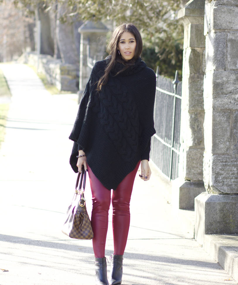 A poncho offers comfort akin to a blanket. The 2021 runways have witnessed many celebrities like Victor Glemaud and Jil Sander making ponchos a trend-worthy silhouette. Go for leggings like leather pants. As the color of your pant is red, the failsafe color of the poncho will be black or navy blue. Complete the ensemble with a pair of ankle boots. This outfit is fashionable and still practical.