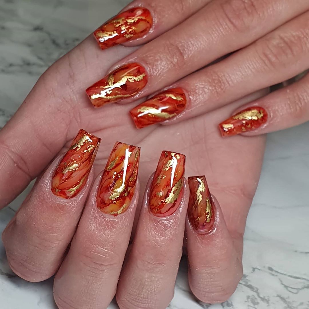 14. Fiery Water Orange and Red Marble Nails