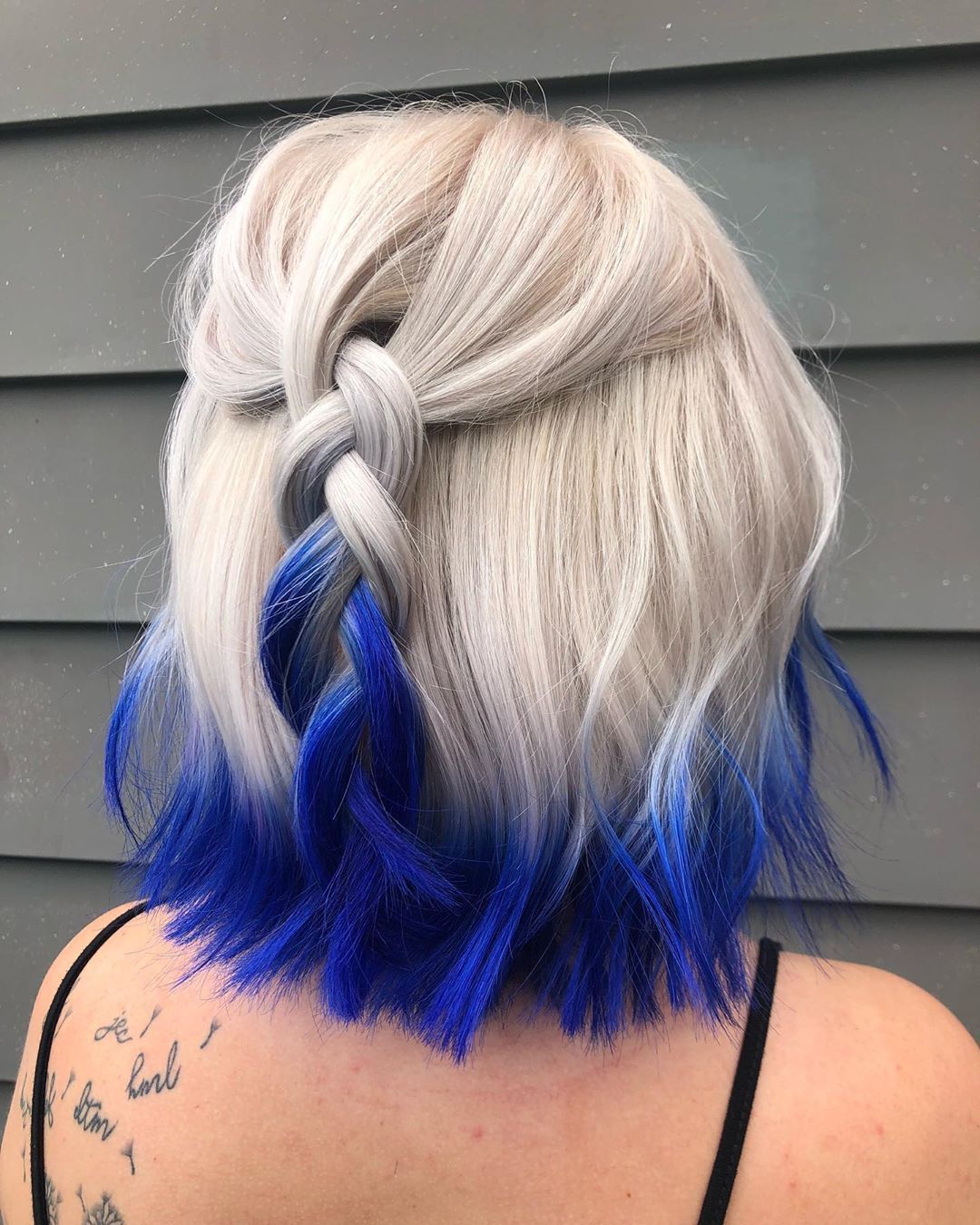 If you’ve ever wanted hardcore rocker hair, this is the look to emulate. The style is its own work of art, but the mix of platinum highlights, chunky blue streaks, and stark roots is sizzling. It will be a beautiful surprise for others when you move your head.