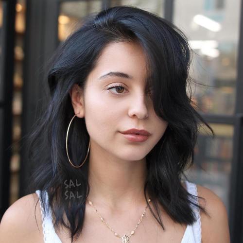 Shaggy lob with side-swept bangs combines the trendy lob (long bob) with shaggy, textured layers, and incorporates side-swept bangs for a fashionable touch. It offers a balance between a relaxed and sophisticated look, providing versatility and style for those with straight black hair.